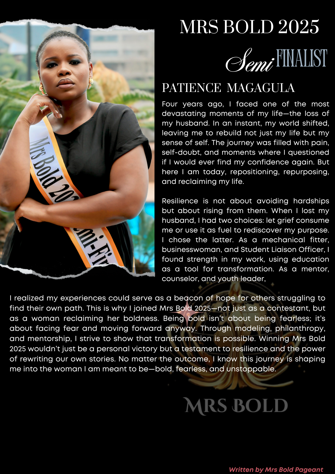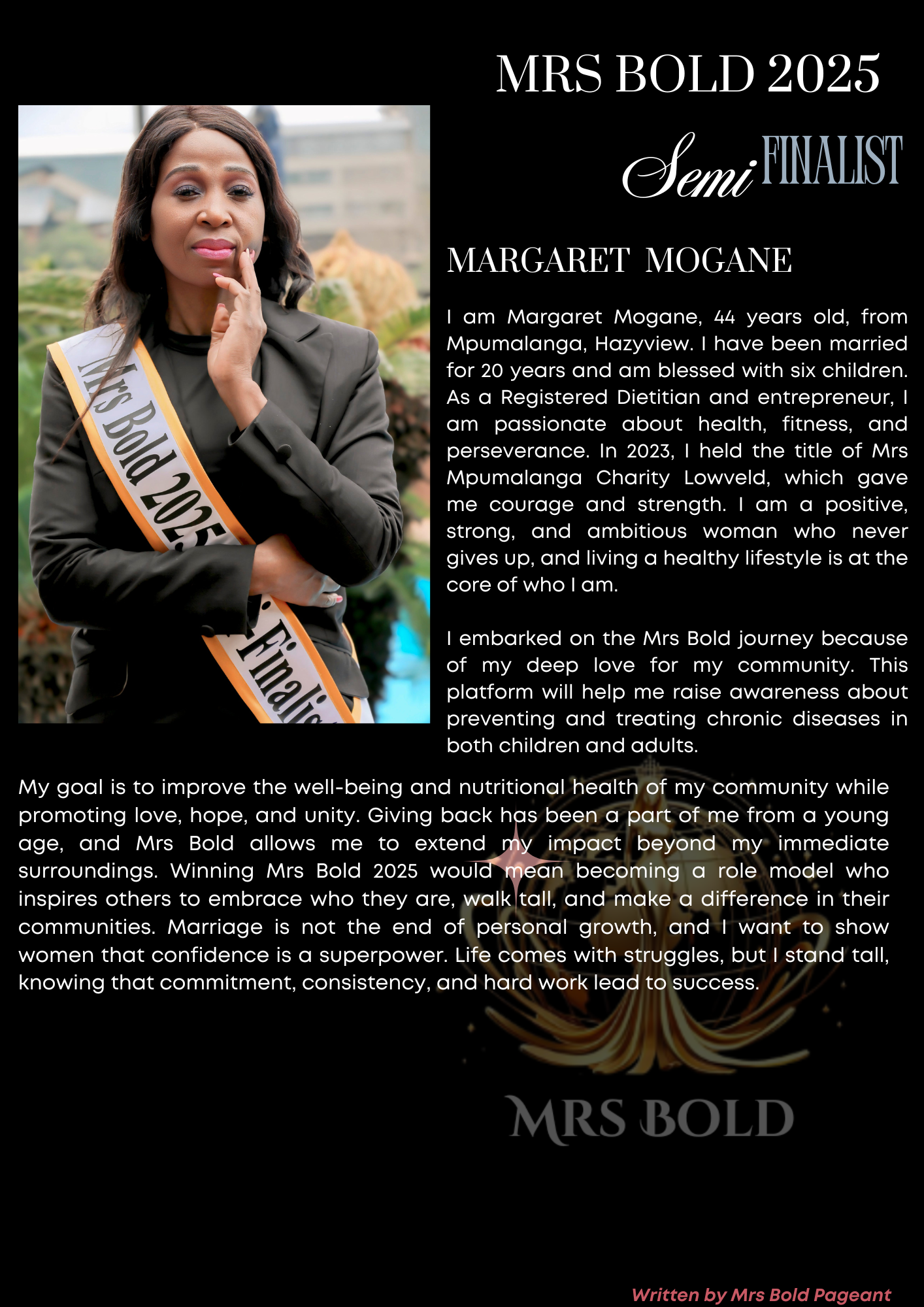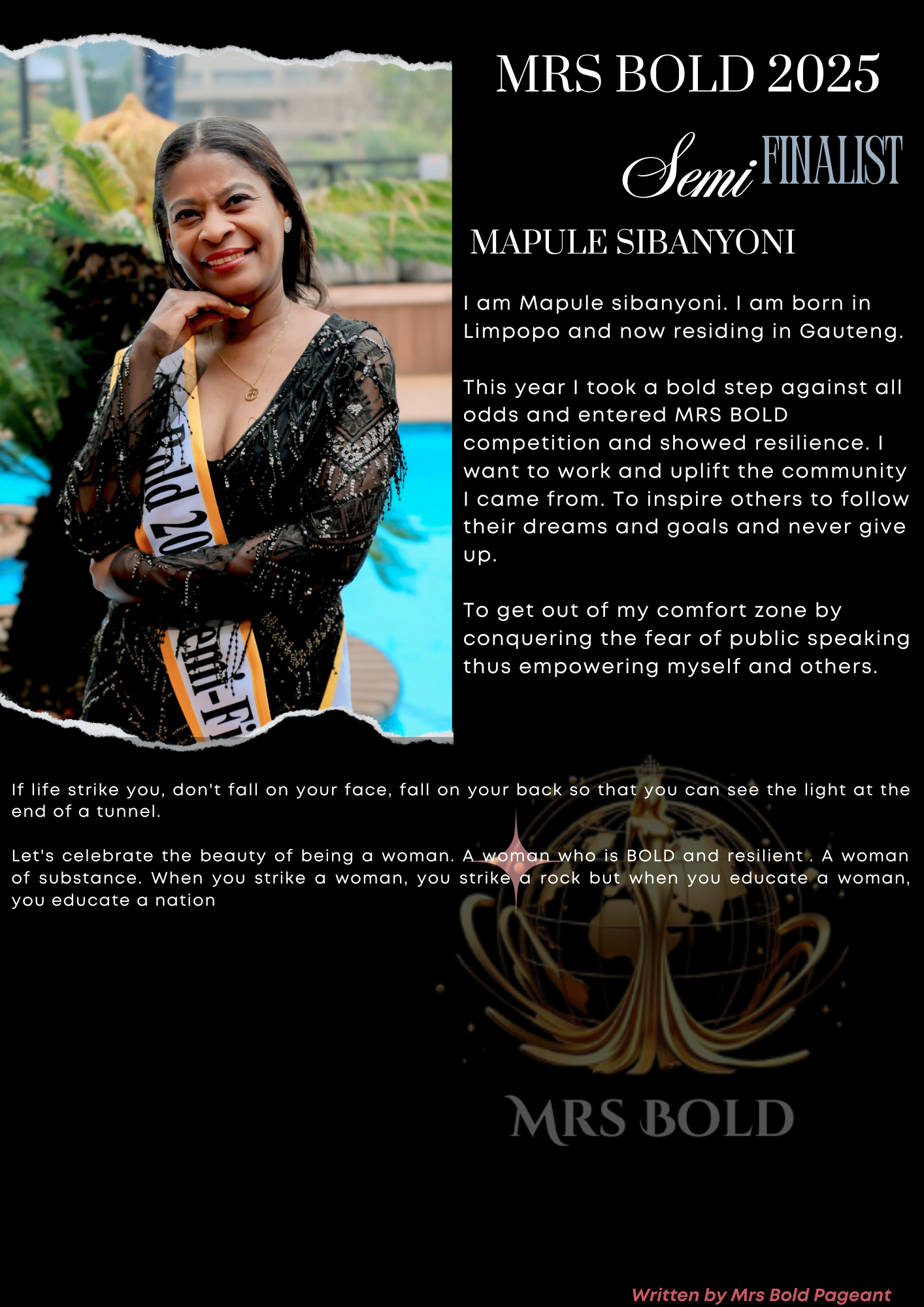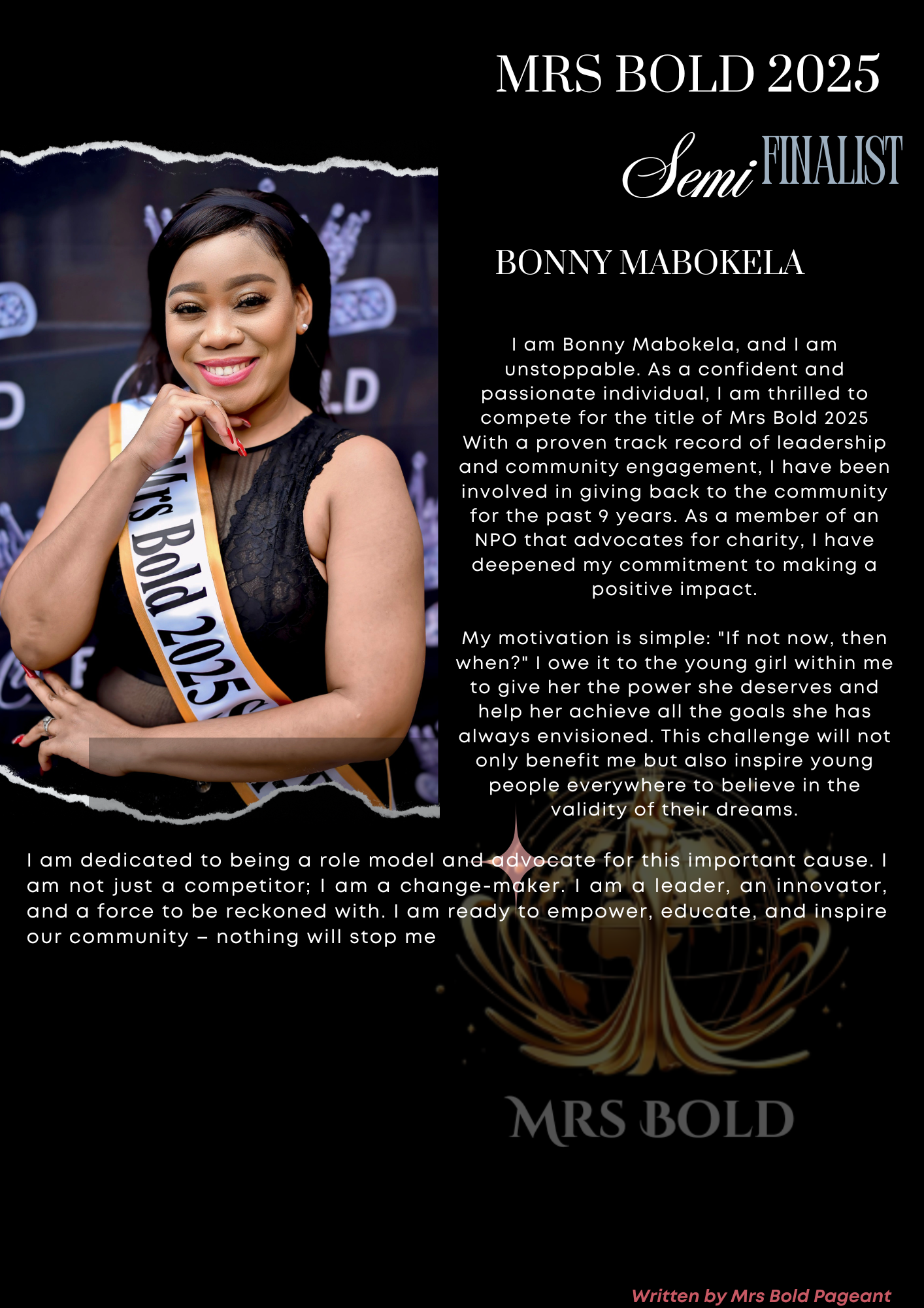 Meet the Mrs Bold 2025 Finalists These phenomenal women are vying for the coveted title, a R150,000 cash prize, and the once-in-a-lifetime honour of representing the African continent at the Mrs Transcontinental Pageant in Atlanta, USA – 2026. Amelia Konote Read More Ellenise May Read More Motshidisi Mohwande Read More Charlene Elliot Read More Joyce Vilakazi Read More Andiswa Jaku Read More Zulfah Mangera Read More Patience Magagula Read More Mapule Sibanyoni Read More Bonny Mabokela Read More Margareth Mogane Read More Nadeena Le'Tang Lorem ipsum dolor sit amet, consectetur adip iscing elit, sed do eiusmod tempor incididunt. Read More Natasha De Matos Read More