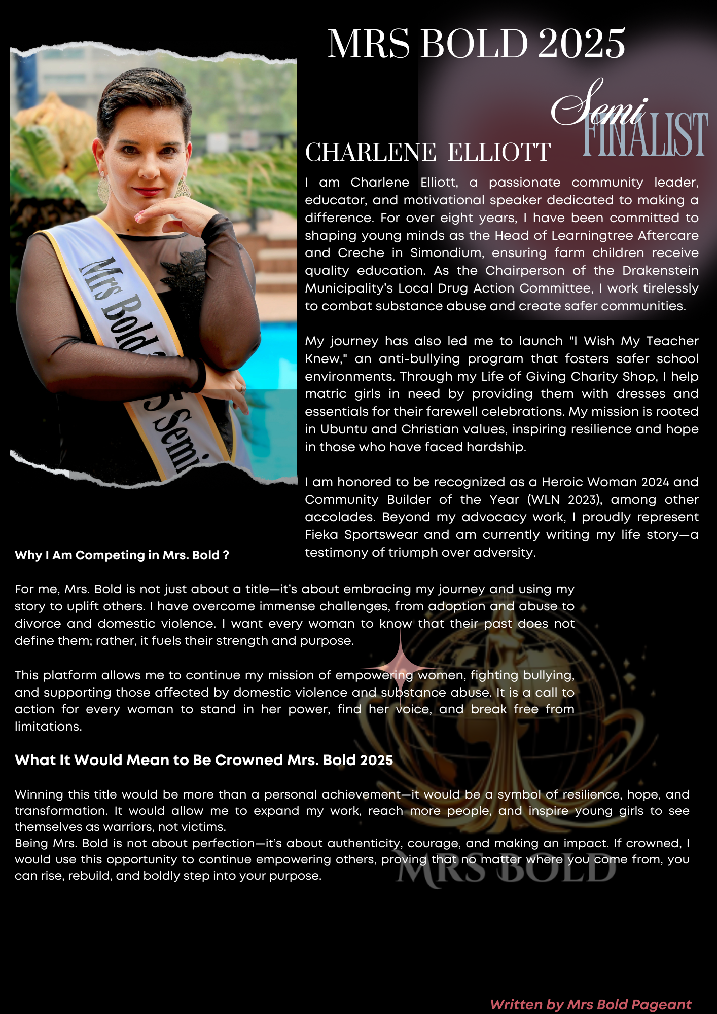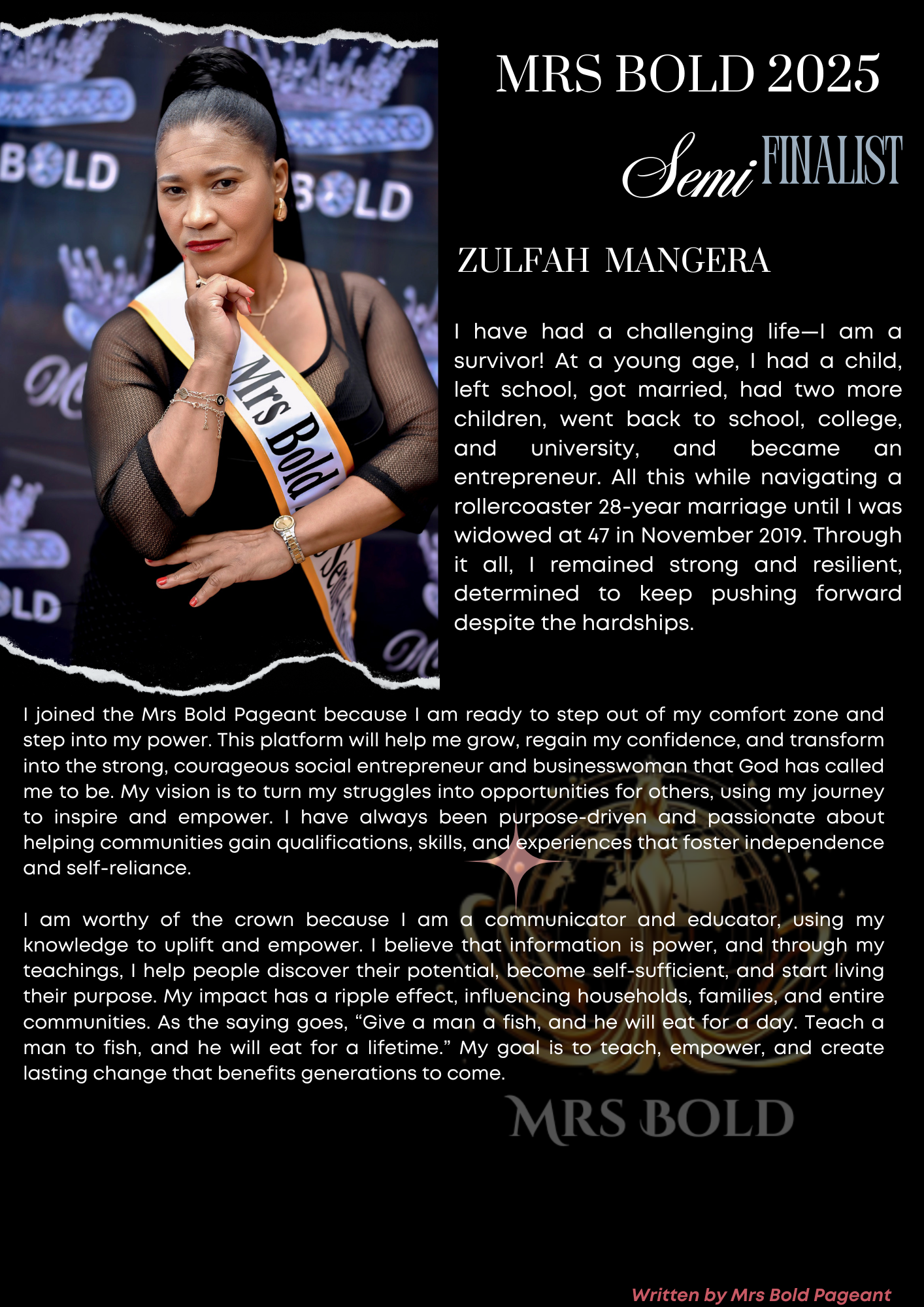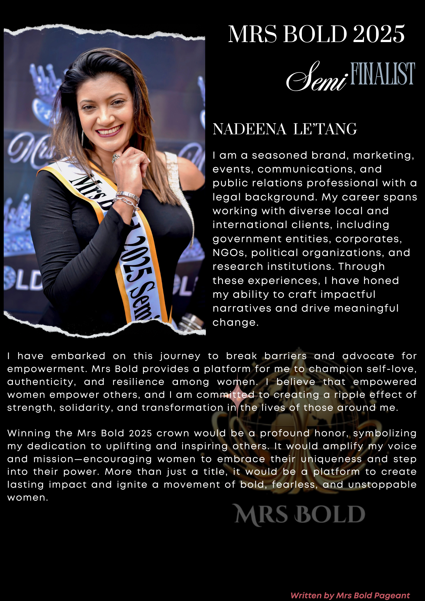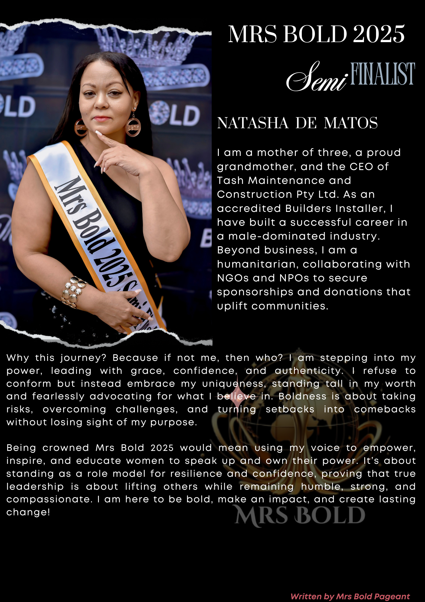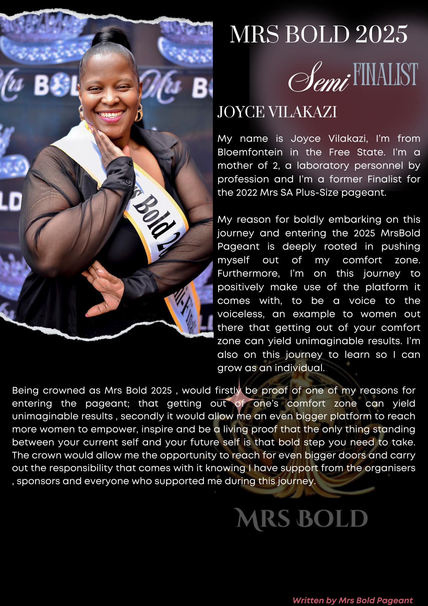 Meet the Mrs Bold 2025 Finalists These phenomenal women are vying for the coveted title, a R150,000 cash prize, and the once-in-a-lifetime honour of representing the African continent at the Mrs Transcontinental Pageant in Atlanta, USA – 2026. Amelia Konote Read More Ellenise May Read More Motshidisi Mohwande Read More Charlene Elliot Read More Joyce Vilakazi Read More Andiswa Jaku Read More Zulfah Mangera Read More Patience Magagula Read More Mapule Sibanyoni Read More Bonny Mabokela Read More Margareth Mogane Read More Nadeena Le'Tang Lorem ipsum dolor sit amet, consectetur adip iscing elit, sed do eiusmod tempor incididunt. Read More Natasha De Matos Read More